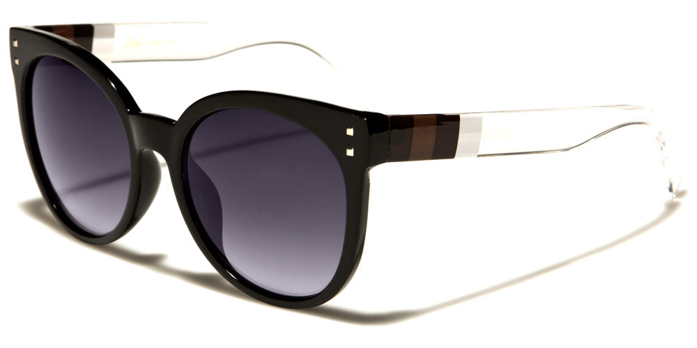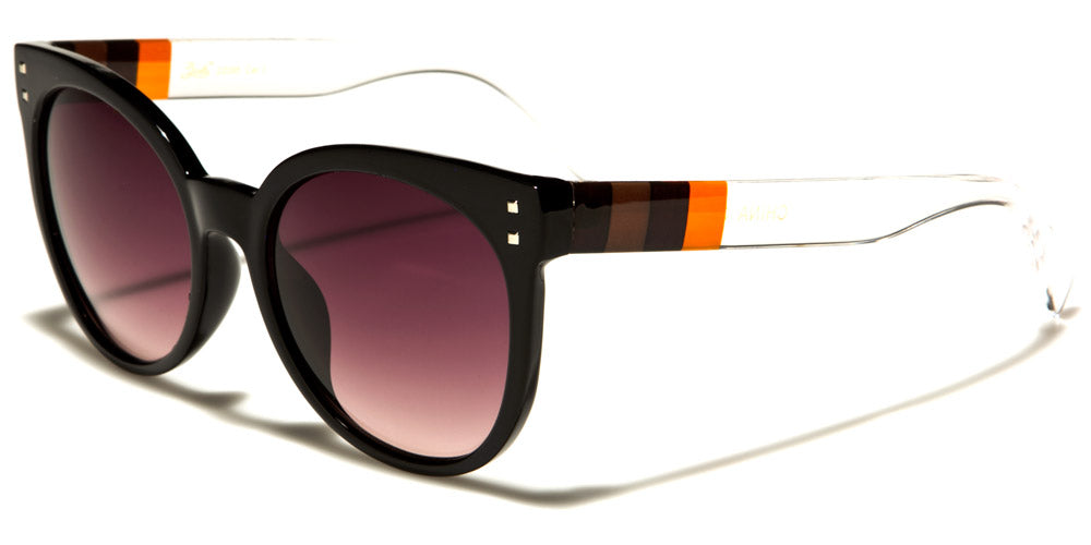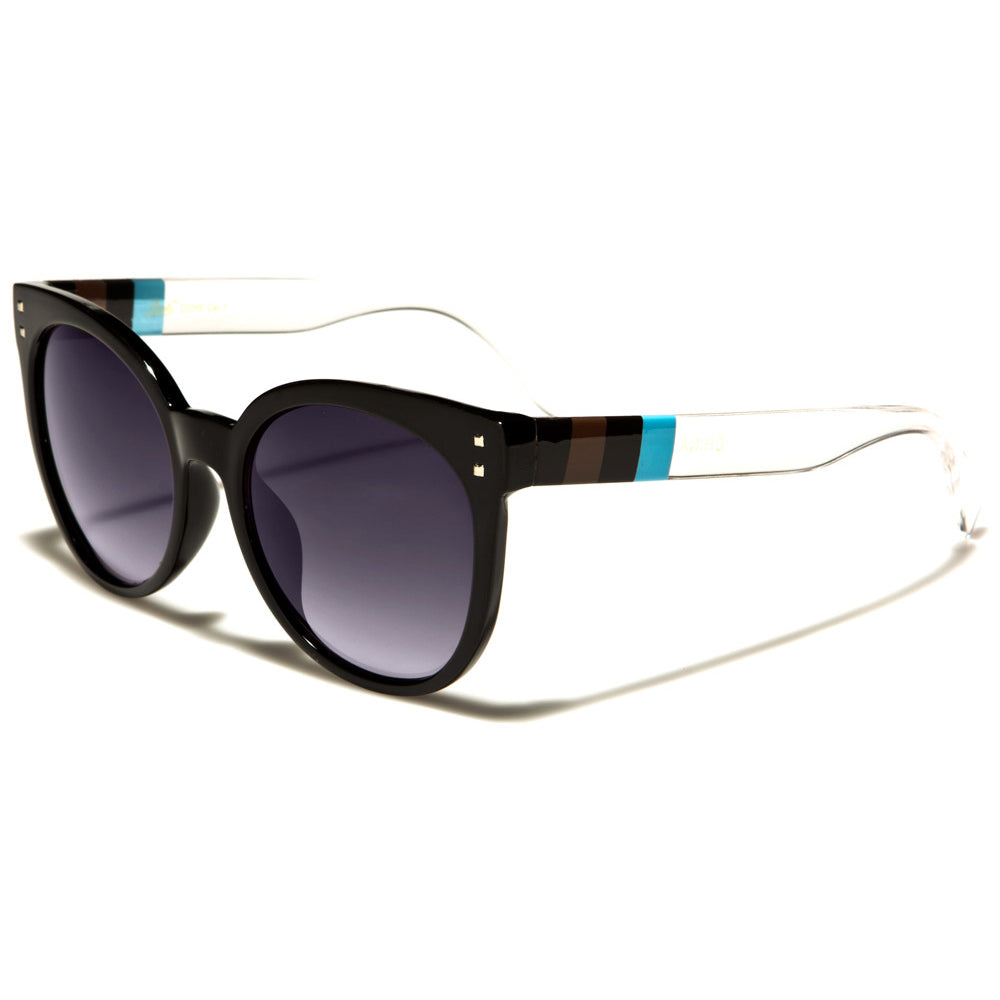 These sunnies feature dark round lenses and a wayfarer frame with accent stripes in red or turquoise.