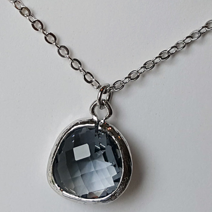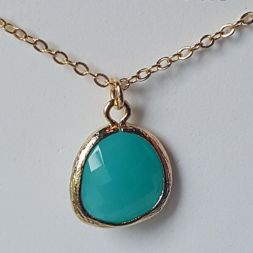 Glass teardrop gemstone is 1/2"x5/8". Chain is 16" long.